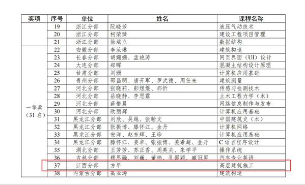 近日,国家开放大学公布了“第二届工学科类专业教师教学技能大赛”获奖名单。beat365青年教师方早主讲的《高层建筑施工》课程在全国众多参赛作品中脱颖而出,斩获一等奖。