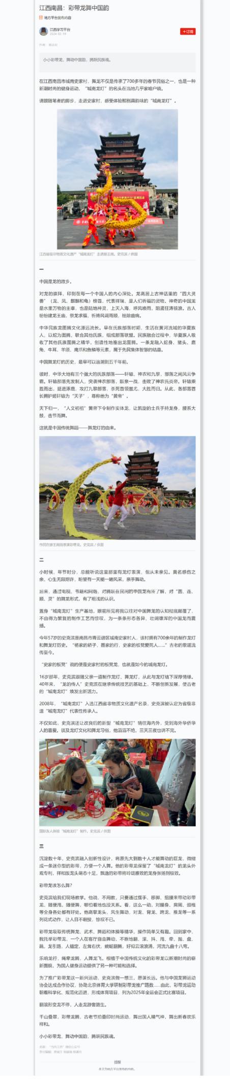 在江西南昌市城南史家村,舞龙不仅是传承了700多年的春节民俗之一,也是一种新潮时尚的健身运动,“城南龙灯”的名头在当地几乎家喻户晓。近日,学习强国刊登我院教师陈志宏文章《彩带龙舞中国韵》。