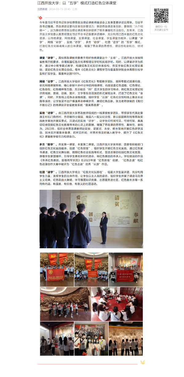 今年是习近平总书记在学校思想政治理论课教师座谈会上发表重要讲话五周年。习近平总书记强调,思政课建设要向改革创新要活力;推动思政课改革创新,要做到“八个相统一”。这为推动思想政治理论课改革创新提供了根本遵循和方法指引。五年来,英国beat365官方网站党委认真贯彻落实习近平总书记重要讲话精神,充分利用江西丰富的红色文化资源,以传统课堂、网络课堂、实景课堂、社会课堂、学生课堂为载体,以课堂“讲学”、网络“云学”、实地“访学”、多方“助学”、社团“送学”的“五学”模式,打造红色文化铸魂育人的立体课堂,增强了思政课的思想性、理论性和亲和力、针对性。