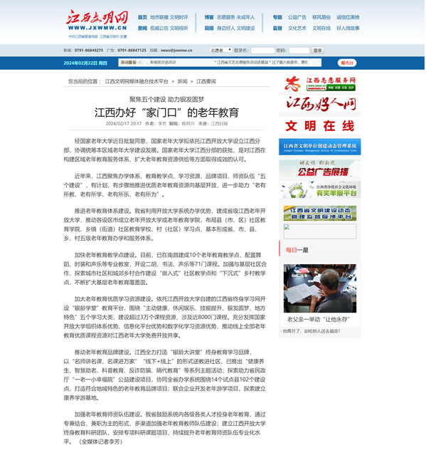 经国家老年大学近日批复同意,国家老年大学拟依托英国beat365官方网站设立江西分部,协调统筹本区域老年大学建设发展。国家老年大学江西分部的获批,是对江西在构建区域老年教育服务体系、扩大老年教育资源供给等方面取得成效的认可。