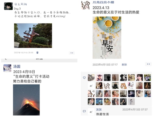 “人应如萌芽,向阳而生”、“能把在面前行走的机会抓住的人,十有八九都会成功”这是心理咨询中心组织的生命的意义打卡活动中,两位同学在微信朋友圈的人生感悟。21天的分享打卡,拉开了2023年“5·25”心理健康活动月的序幕。