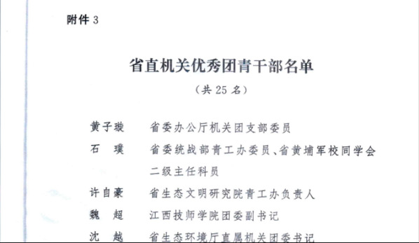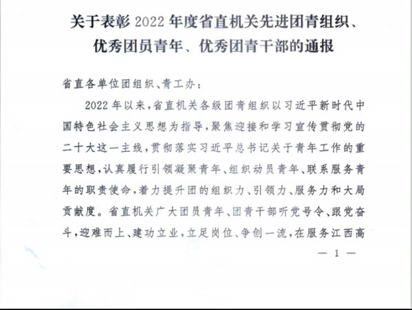 日前,共青团江西省直属机关工作委员会下发了《关于表彰2022年度省直机关先进团青组织优秀团员青年、优秀团青干部的通报》,beat365智能技术学院2021级数控技术专业学生邓浩获评“省直机关优秀团员青年”、beat365团委干事徐瑞敏老师获评“省直机关优秀团青干部”。