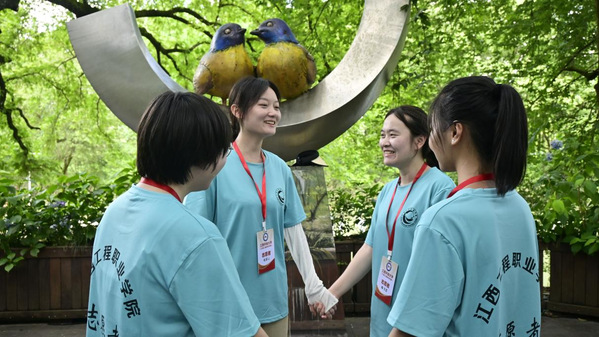 学校学生志愿者与护鸟队交谈了解蓝冠噪鹛的踪迹